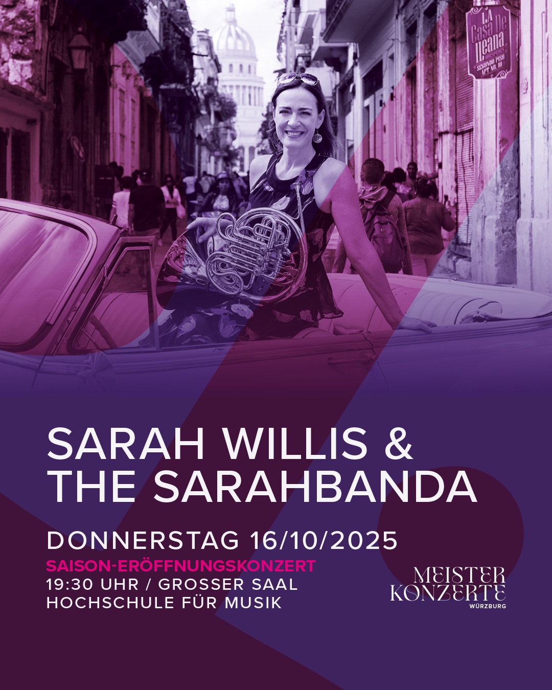 Gleich zu Beginn bringt Sarah Willis, Hornistin der Berliner Philharmoniker, mit ihrer Sarahbanda kubanisches Lebensgefühl in den Konzertsaal – ein mitreißender Abend zwischen Mozart und Mambo, voller Energie, Groove und Charme.